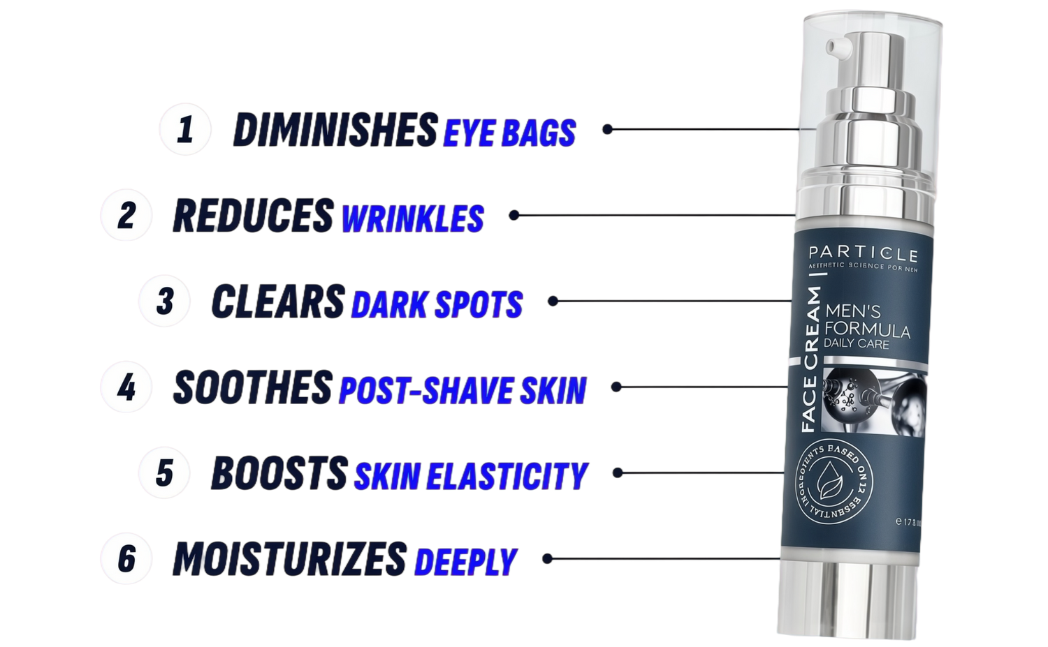 Particle Face Cream is a 6-in-1 powerhouse that reduceswrinkles, diminishes darkspots, and alleviates eyebags, all while nourishing with Dead Sea minerals.This easy,all-in-one solution gives menfresh, youthful skin every day.